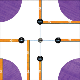 The map is split into four deployment zones, with each player choosing a corner of the map to deploy from. Each player may deploy within range 5 of their designated corner, allowing them to get into the thick of it pretty quickly. It’s a quarter circle deployment zone, which looks intimidating to set up but is actually quite simple in practice. If you measure from the corner of the battle field with one edge of the range 5 tool, it will give you an idea of where you can place your characters.