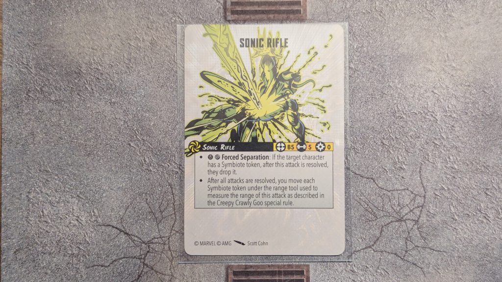 During the game, players can knock Symbiotes loose from their hosts by using Sonic Rifles. The Sonic Rifle gives the character holding it a new attack called Sonic Rifle. This attack is a Beam 5, Strength 5 attack that costs 0 power to use. It has two special rules, one of which also references the Creepy Crawly Goo rule.