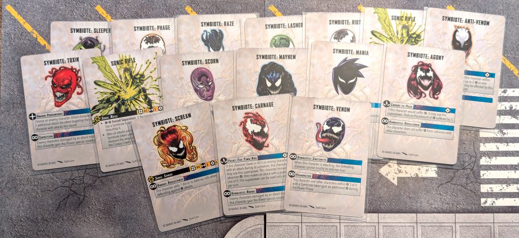 The main feature of this scenario is the Symbiote Deck. This deck is comprised of 16 cards, 14 symbiotes and 2 sonic rifles. Each symbiote has their own special abilities, which can lead to some crazy combos with characters.