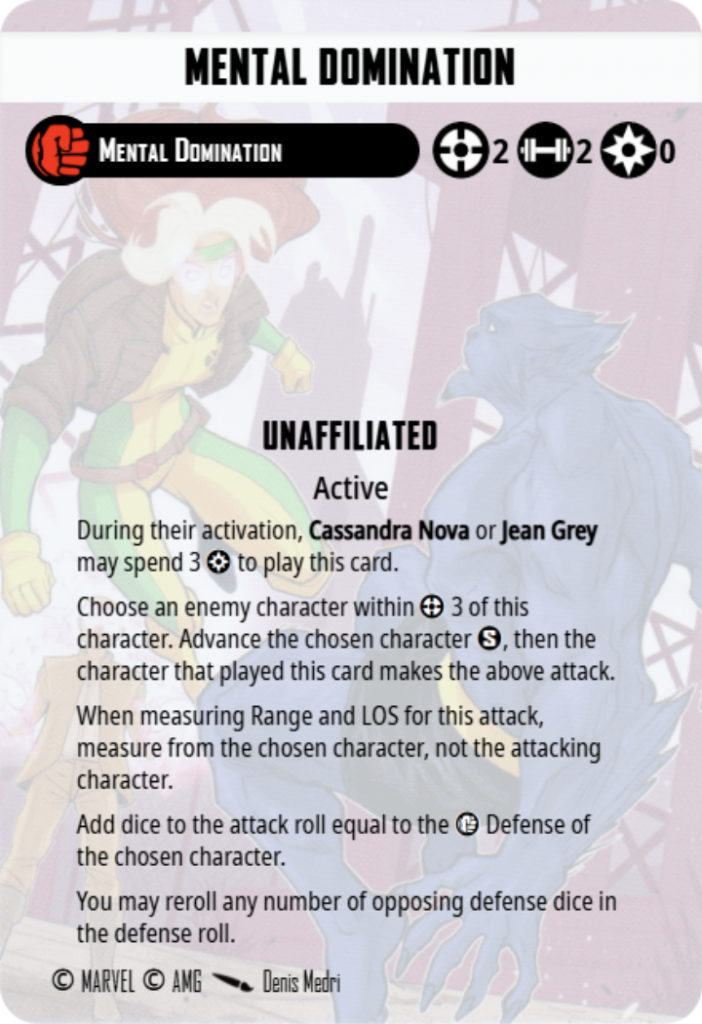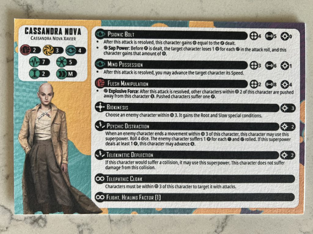 Cassandra Nova has a ton of tricks up their sleeve – and a lot of text on their card, some of which barely gets used. Flesh Manipulation and Biokinesis are both far too expensive for Cassandra to pay for and don’t quite fit into the play style of the character or the affiliation in my experience. Power is better spent for Mind Possession, Psychic Distraction and sometimes both at the same time (the advance granted by Mind Possession will trigger Psychic Distraction for a nice one-two). Psionic Bolt being Range 4 means it can be used while Cassandra is stood safely outside of Range 3 thanks to Telepathic Cloak.
