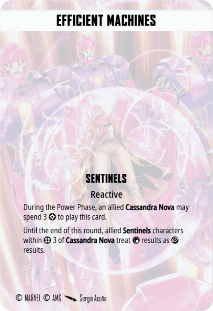 This card feels cool at first, but then you realise that Cassandra Nova has to be within Range 3 of multiple Sentinels. I’ve already mentioned that I only played Cassandra on Infinity Formula, where they hold down a flank on their own, and I only play one Sentinel Mk4 at a time. So for me, this card never really came into consideration, especially given Cassandra Nova’s power shortage.