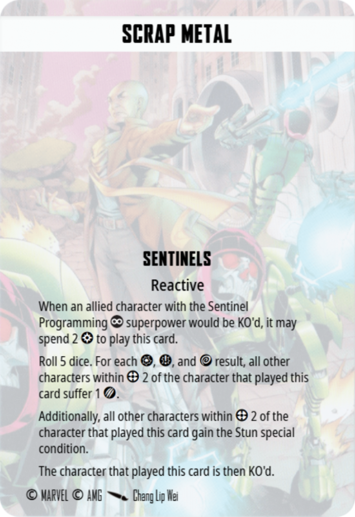 A total of 2 power off two Sentinels is basically free, as they’re often swimming with power. Turning off defense dice rerolls works great into teams like Web Warriors and Invaders. Playing this at the right time, when you’ve got your opponent surrounded and taking away their Spider-sense, the Sentinels really start to feel like the gigantic smashy robots they really are.Â
