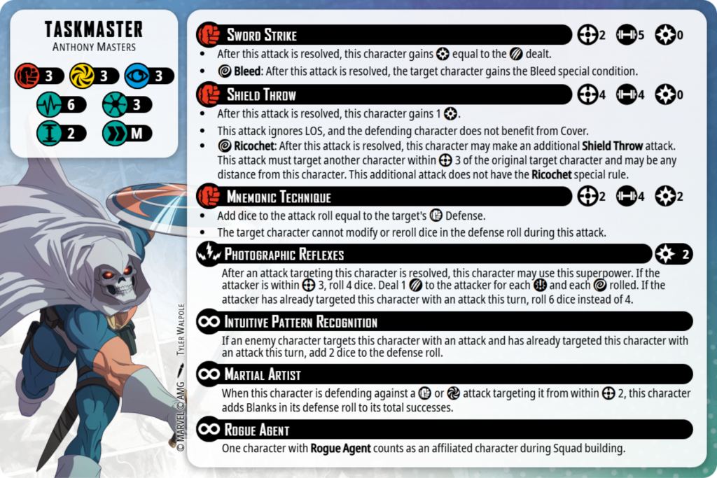 Taskmaster has the Rogue Agent superpower, meaning he can serve as a 3 threat affiliated character, allowing you to splash more non-Sentinels while staying affiliated. There isn’t much to say here outside of the fact that Taskmaster is a 3 threat; he doesn’t do much. I’d just send him off on a flank to pick up an Extract. Nothing fancy.