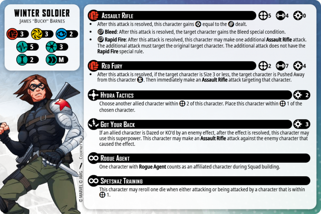 Often I had Winter Soldier stand at the back, behind a couple of Sentinels. He can then Hydra Tactics twice off both Sentinels to now be on the other side of the board, attack twice, pick up an Extract and then use the power he just generated from a handful of Assault Rifles to Hydra Tactics back! You’ll need to pause here to show your opponent Winter Soldier’s card — yes, he can do it multiple times a turn; yes, he can do it while holding an Extract; yes, it’s nuts.