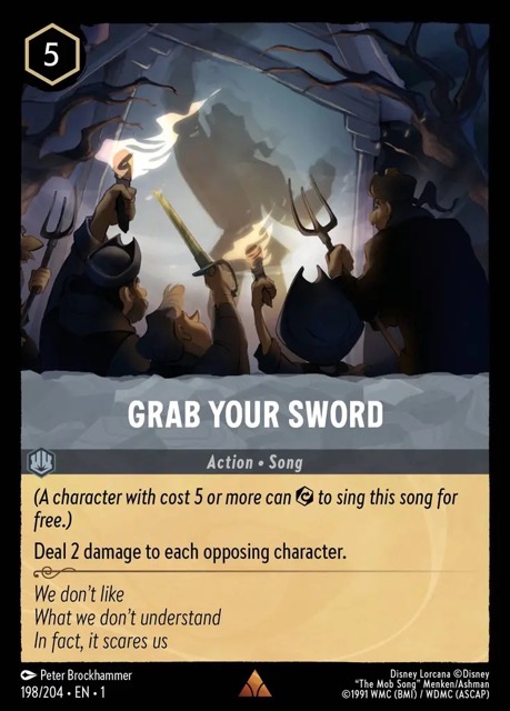 “Cards that everybody used to play a lot but don’t play so much anymore” is clearly a theme here, and this is another one. This was such a pivotal card in many games that I’ve played, and that it’s a shotgun blast in song form has always been of value for clearing out accumulated aggro-vators or nuisance 1 or 2 Willpower effect-bearing characters that the opponent never wants to exert. It’s another one as well where I hope they manage to outdo the original illustration.