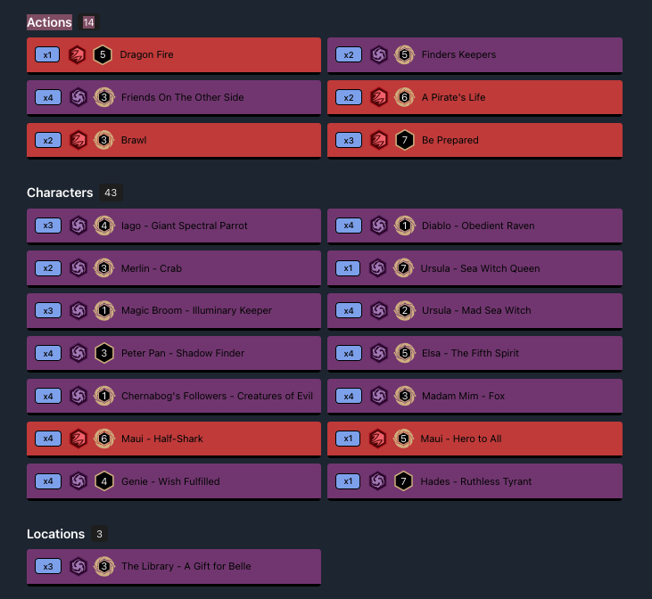 The first set I fumbled, playing with an unfamiliar deck and also coming over from playing a possibly unhealthy amount of Magic: The Gathering lately. It’s just such a different mindset, not having to hyperanalyze board state, hand cards, triggers, possibility of pulling off a massive combo, dealing with mana shortage/flood, going up against absolutely degenerate decks in the Platinum tier on Arena…Lorcana feels so much more chill, which is likely why so many early adopters were in fact MTG refugees.