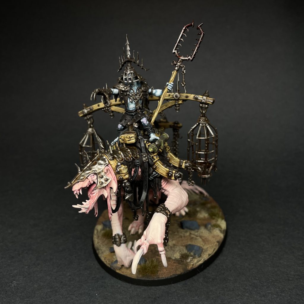Closing out our Stormbringer collection is part one of two of Swampboss Skumdrekk, a Kruleboyz hero who I wasn’t even aware was a special character. I’m kinda surprised it wouldn’t close out on a Stormcast hero, saving Bastian Carthalos for issue 80 or something, but here we are. We only get half the kit this week, along with instructions for putting the big bad boi together. It calls out the gibbets and Skumdrekk as subassemblies to paint separately, and I can fully get behind that. He’s an examplar of the Kruleboyz aesthetic – a cruel, rickety, repulsive, mancatcher riding a cruel, rickety, repulsive monster. It’s a model that’s definitely not for me, but I can’t deny that it’s representative of the faction at large.