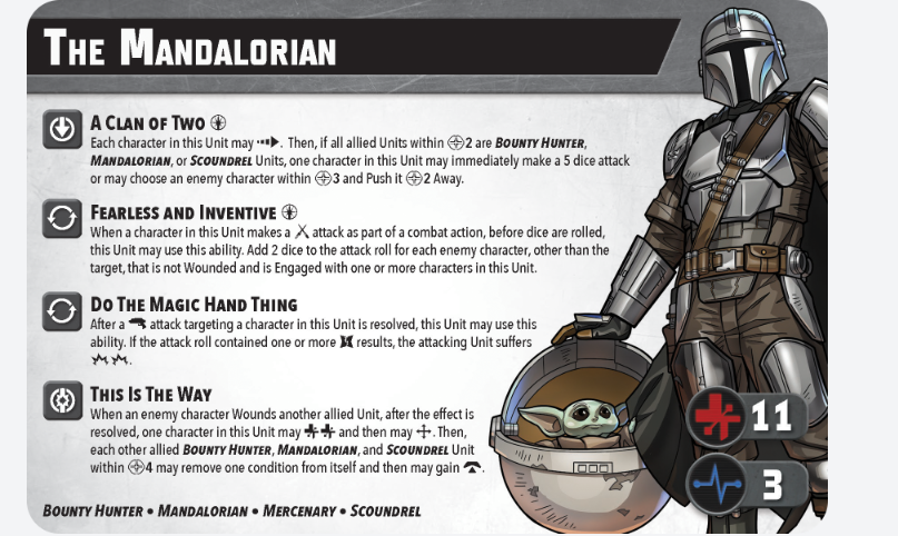 But let’s say your opponent does get that elusive wound. Was that actually a good thing or did they just progress your board state? Everyone should be well aware of the tankiest primary in the game (take a seat Dooku) and his innate ability to reposition when an ally is wounded, but how many people know about the second part, handing out hunkers and removing conditions to models within 4? One of the faction’s weakness is that Mandalorians don’t roll many defense dice making Expose particularly powerful against them. Hunkers are a good way to help combat that weakness and the condition removal is always nice to keep them moving back on points.