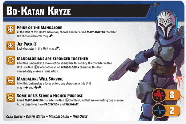 Mandalorians are extremely synergistic which is mainly due to Stronger Together allowing free focus actions when moving. There is also the Armorer’s innate ability which prevents the increase of force costs for all Mandos, allowing Stronger Together to always be a free ability. Nearly all the models in your list will have the ability to jump themselves or another Mandalorian aiding their overall mobility. This allows Mandos to access difficult to reach points or negate the effects of being pushed off high points as they can usually jump back on. If your opponent recognizes this, they may just opt to wound, but this isn’t that easy either. Mandalorian armor is extremely resilient allowing fantastic expertise and even access to protection with Bo Katan.