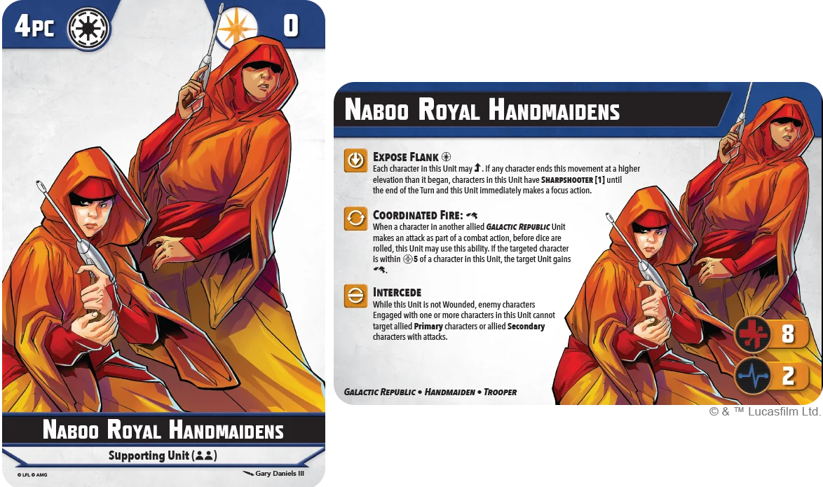 No shoves at all is a tough pill to swallow and five base attack dice means they will be relying on an Expose Flank to reach any reliable kind of output. The most notable element here is access to a jump on one, which can allow them to access some unexpected locations on their activation. Their defensive profile is similarly unexciting, but there is a chance for them to negate a crit if they’re lucky which is not something a lot of supports have access to. The biggest positive thing here is simply having the Handmaiden tag, which means that provided Padmé is close by you can add two free damage to their output with no roll required.