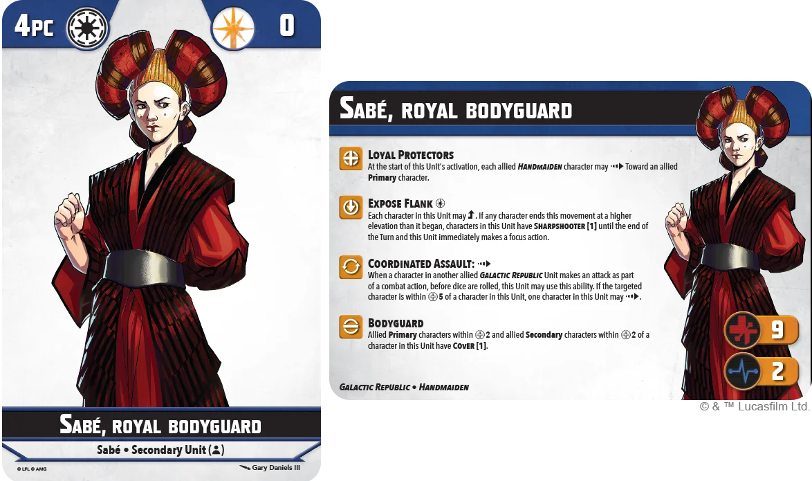 You know and love it from the Magnaguard, more defensive dice against ranged attacks is always good. Unique to Sabé is the fact that she is always a Secondary unit within R2 of herself, so gets to benefit from Cover at all times!