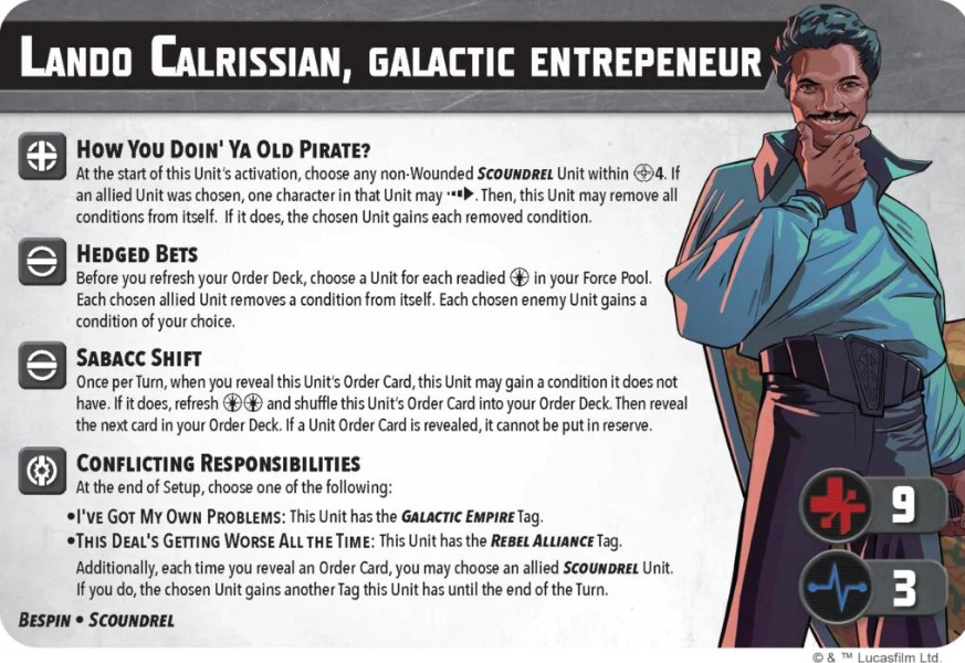Finally, we have Lando’s unique identity called Conflicting Responsibilities. This ability alone is why the entire box is worth it because with every release, it will only get better. At the end of setup, you get to choose one of two tags to apply to Lando, Rebel Alliance or Galactic Empire. Additionally, whenever you reveal an order card, you may choose an allied Scoundrel Unit to gain one of the tags Lando has. This means that ANY Scoundrel in the game has the option to become Empire or Rebel alliance when fighting alongside Lando, giving you some deep options for list building. I’m going to eagerly look at any new scoundrel, empire, and rebel release now and consider how they fit in a What Have We Here shell.