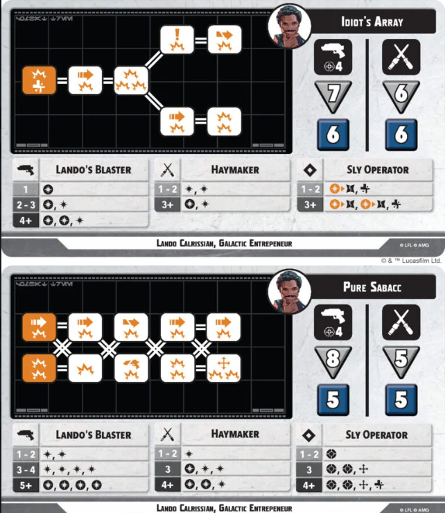 When it comes to combat, there is an obvious benefit to shooting with Lando. Taking a quick look at his Idiot’s Array side, we notice decent dice and expertise for ranged and poor dice for melee but it’s at least an option. His defense is honestly fine even though he doesn’t get many blocks from expertise. The ability to shut off 2 crits on 3 while rolling 6 dice is reasonable. The tree itself can spike early in damage giving you 5 damage on 3 successes with a shove/heal. I tend to focus on the early parts of the tree just because it’s what’s most likely to consistently happen. Overall, this side is good enough to get work done but… it’s no Pure Sabacc. With his other stance, Lando takes a sizable hit to defense rolling 5 dice with poor expertise but he gains one of the best ranged profiles in the game. 1-2 expertise for 2 hits and 3-4 for 4 hits is outstanding, especially considering he rolls 8 dice. This tree is also shove city! If Lando wants you off a point, you best believe you are getting off that point. He can technically shove 4 times on 5 successes which is a feat not many characters are capable of. The tree does get weird with the criss-crossing but all you really need to know is that the max damage you can do is 8 on this side.
