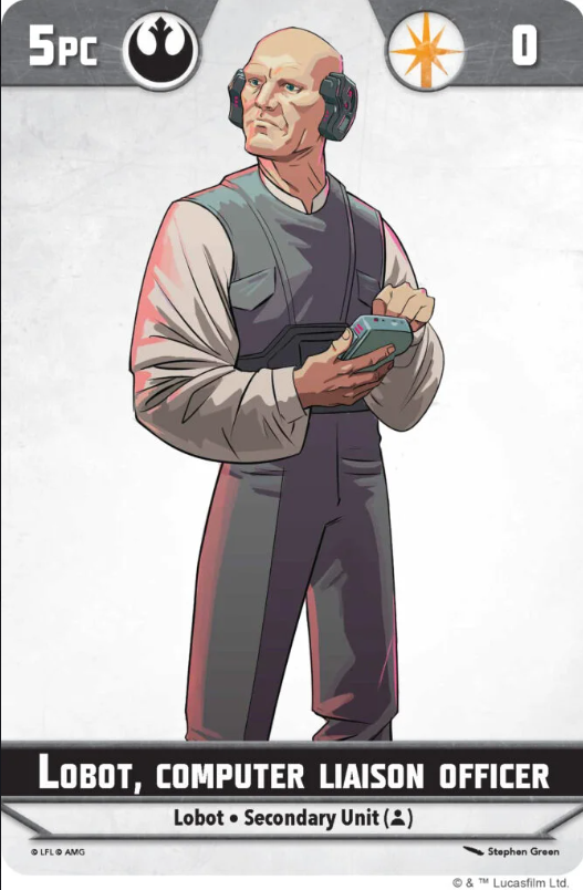 Our next Bespin-themed character is Lobot, Computer Liaison Officer. Equipped with a cyborg construct on his head, this security officer is the definition of efficiency and since he is worth 5 pts, we hope that counts for something.