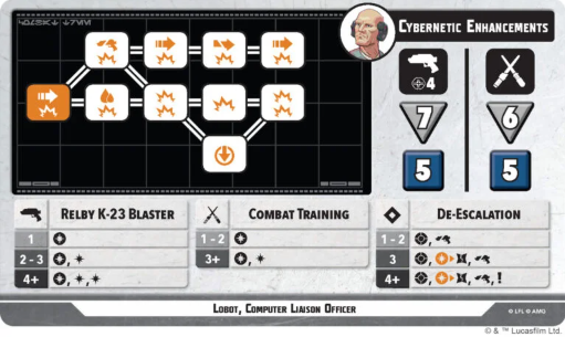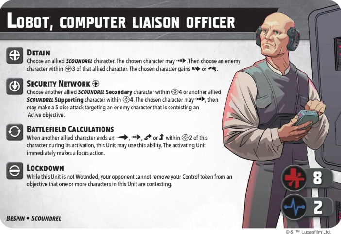 This secondary only has 8 health which is already a bit scary for 5 pts however, Lobot has a plethora of support options to warrant his low health pool. Detain is a powerful tactic that allows any allied scoundrel character to take a dash. Global tactics should always be valued highly and the option to pin/disarm an enemy within 3 is just a bonus. Keep in mind that Lobot is an allied scoundrel and therefore, can pick himself for this dash.