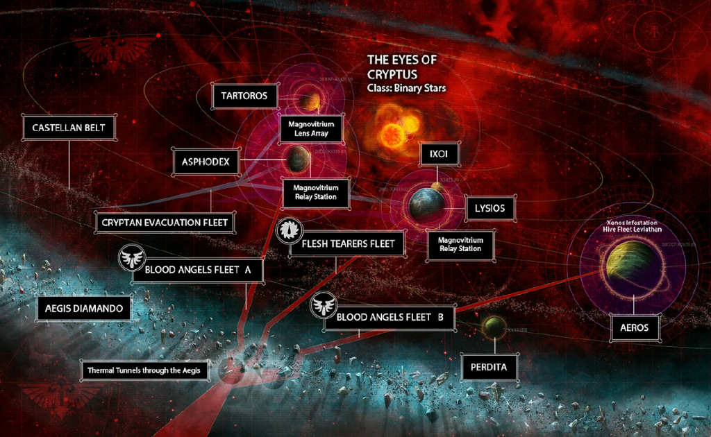 The key to victory in this war was the Necrons’ secret superweapon: The Magnovitrium – the massive solar array designed to siphon power from Crypthus’ twin stars – was a relic of the Necrontyr empire, and could be used to ignite the core of the gas giant Aeros, creating an explosion which could scour the stars of the Tyranid ships while Imperial and Necron ships hid behind the system’s other worlds.