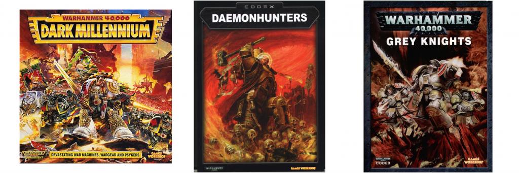 The Grey Knights finally received their own book in 3rd edition with the release of Codex: Daemonhunters, which provided rules and backstory for the armies of the Ordo Malleus. Along with the new lore and rules for Inquisitors, the book re-introduced Grey Knights in power armour, armed with their signature Nemesis Force weapons and wrist-mounted storm bolters. Grey Knights could ride in Rhinos and Land Raiders and be interred in Dreadnoughts.