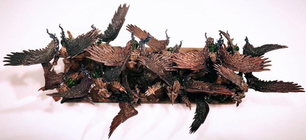 And the reason I love to paint them is the combination of their simplicity and subtlety. Feathers are desperate for drybrushing, and the fact that from a distance that’s basically all you see of the Stryx makes a simple colour shift extremely effective. They seem to shimmer as they traverse the battlefield at great speed. They’re perhaps the best return on investment I have in a model as far as painting effort is concerned.