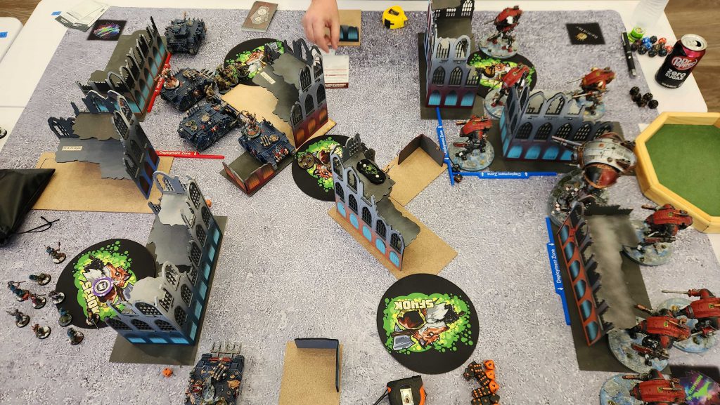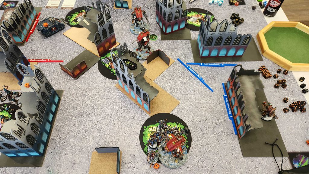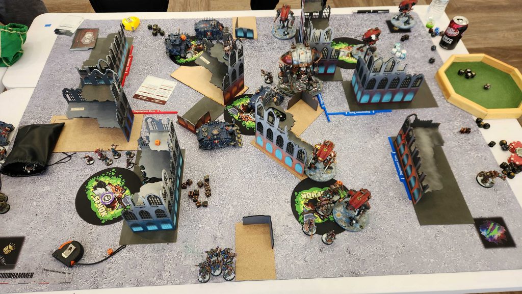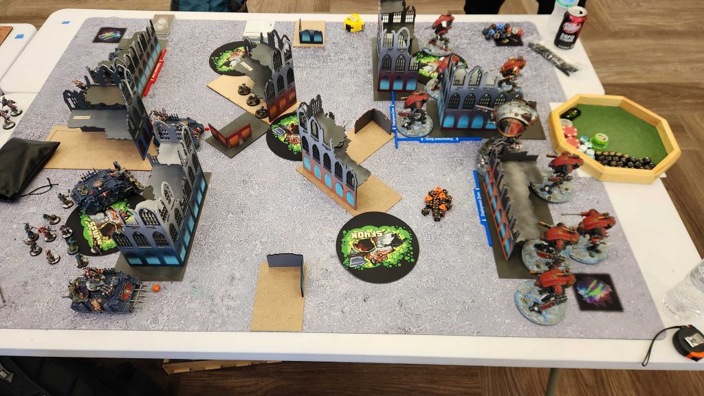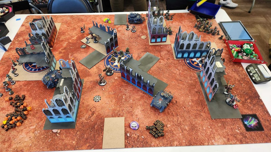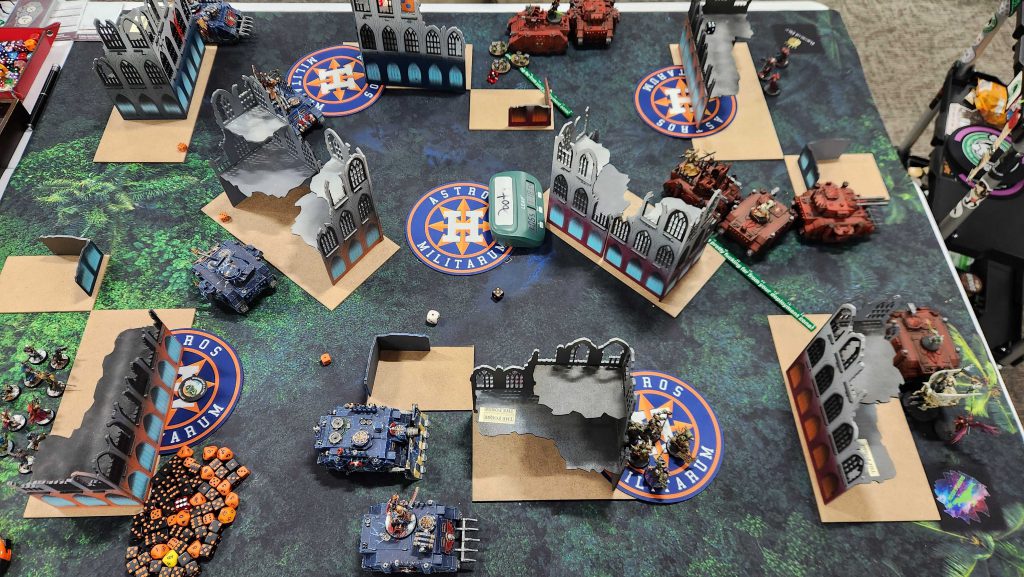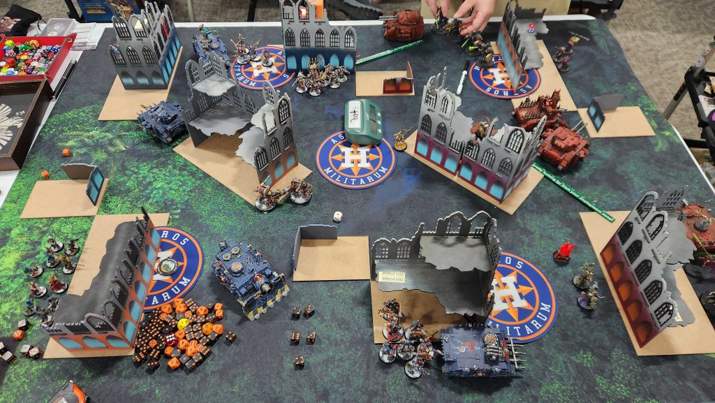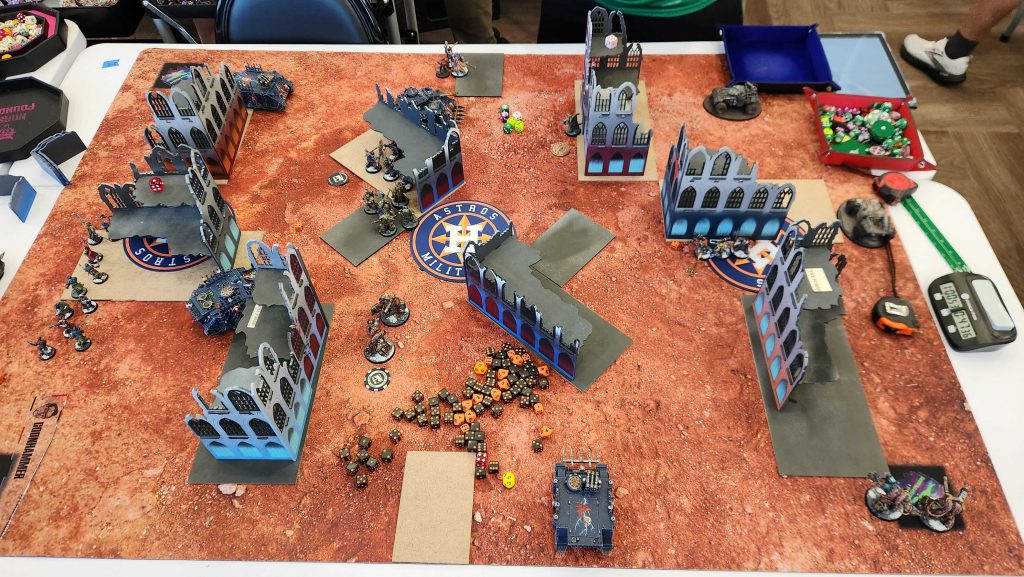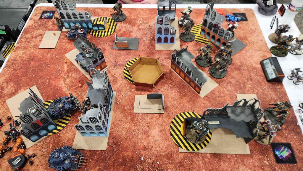 Cool, the other nightmare matchup. Chaos Knights aren’t any better for me – they can hit hard enough to wipe my units, kill my tanks, and out-OC me. I need to take out 5 or 6 of them in the first two rounds to whittle Niall’s army down before they can start causing real problems. And that’s a tall ask.