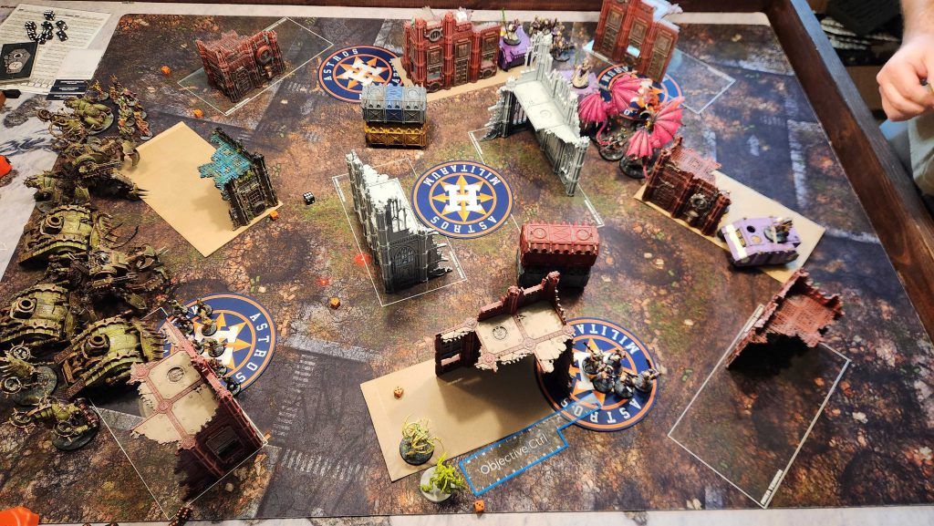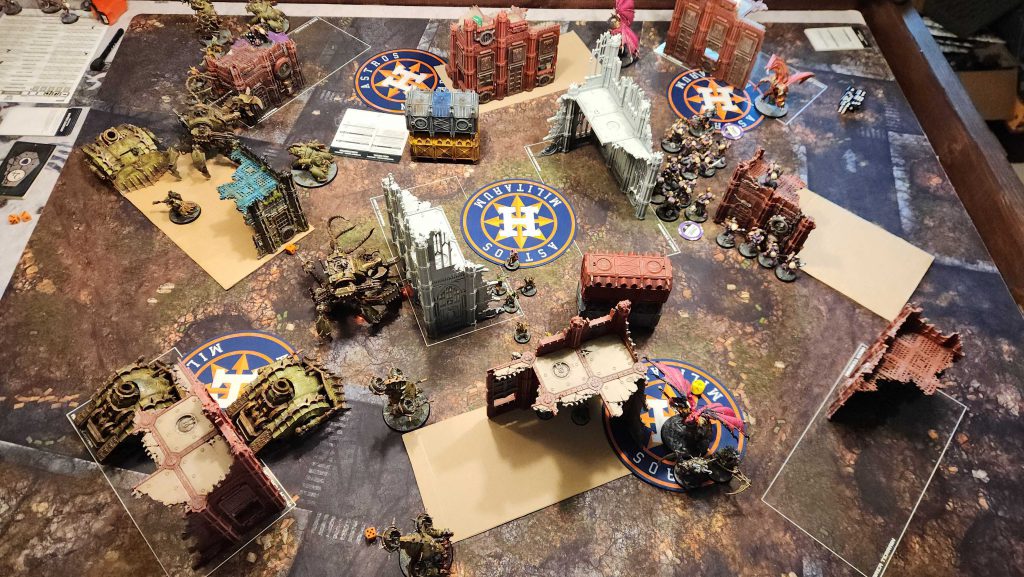 The key takeaway after this game is that i likely don’t want to run two defilers. I revise my list, pulling one out – that frees up 165 points, and I already had 15 unused so now I have 180 to spend. I consider a Daemon Prince but ultimately I figure I can split the value of a Defiler into two units – a Fleshmower bloat-drone and a blight-hauler, giving me two fast, useful units that help solve a problem I have with action economy. I’ll end up carrying that into my next game and finalizing my list with those.