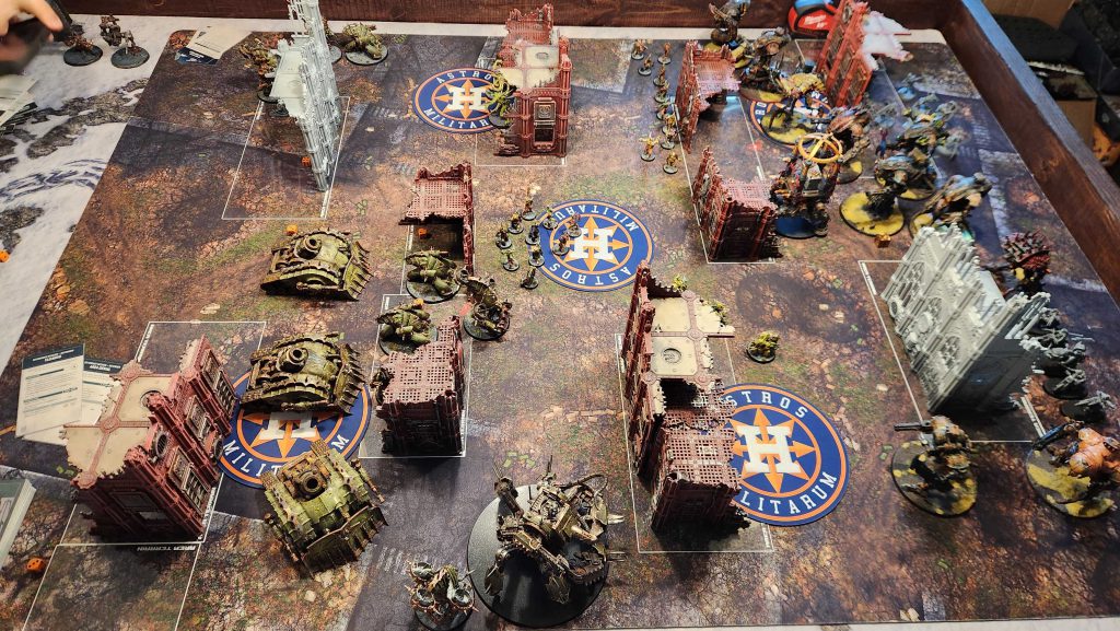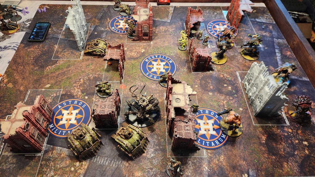 This time around we were running the Chapter Approved 2025-26 missions, with Take and Hold and Tipping Point, testing Layout 7 for the terrain. I haven’t tried that particular layout yet and this was also a good test with the Defiler, which I was playing on a base for the first time. The base isn’t massively bigger than the Defiler, but it does add a bit of length to it, and that’s generally a problem when it can only move 8″. That largely meant that on this terrain, I had ot go around the center ruin to see out into the table, as the base was too large to sit wholly within the 10″x5″ area terrain base.