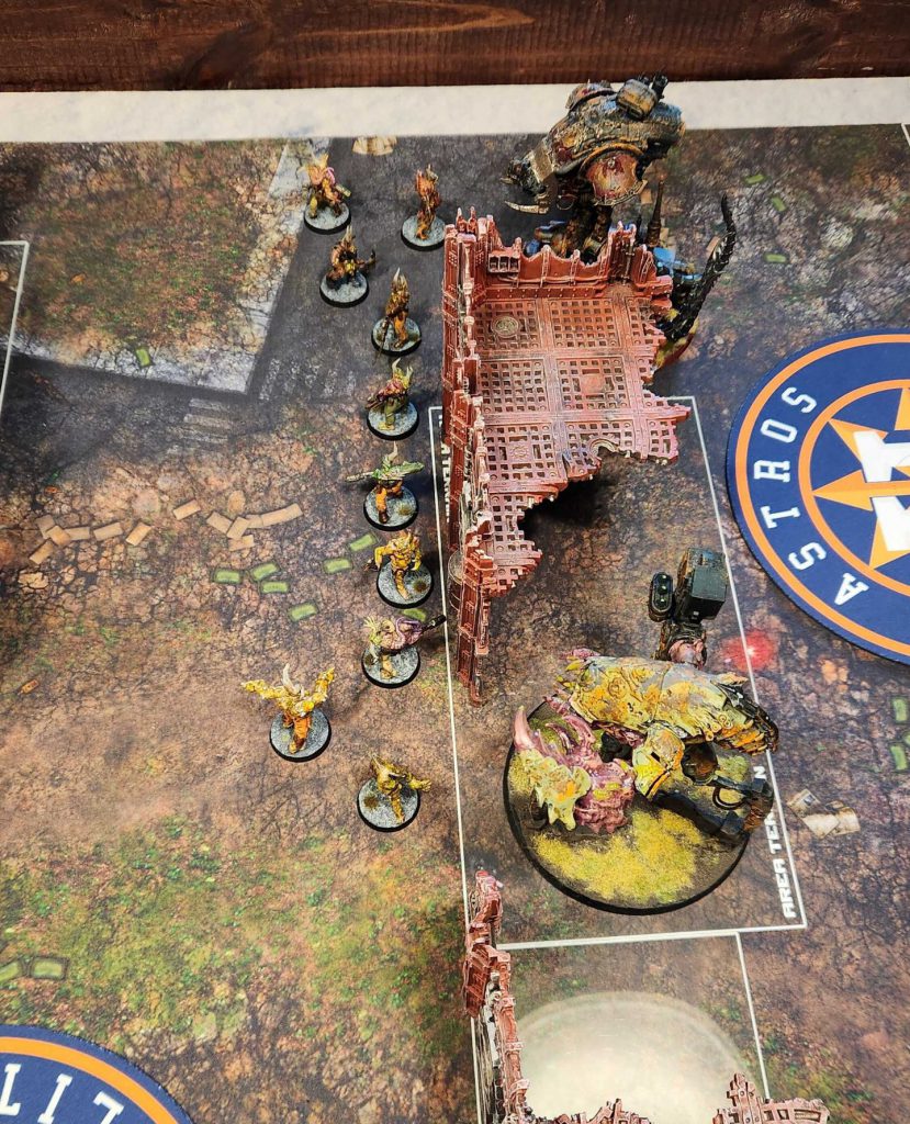 The other two ways to use the Poxwalkers are as back/midfield objective holders and screens – when I’m playing into Coterie, I tend to drop back into my deployment zone far enough to prevent turn 1 charges, and I may screen key vehicles with the Poxwalkers to ensure they aren’t getting tagged and killed too early. But if the Coterie player is smart, they’ll stage and play a bit more coy, going for a round 2/3 assault with many units to try and jam me instead of outkicking their coverage with a couple of faster units that don’t quite get there. In Luke’s case, I can afford to sacrifice the Poxwalkers to stuff him while hanging the Fleshmower out as a juicy target to lure out a war dog or two. I can reliably kill three war dogs per turn, maybe four, and that’s the maximum number I want to deal with at a time.