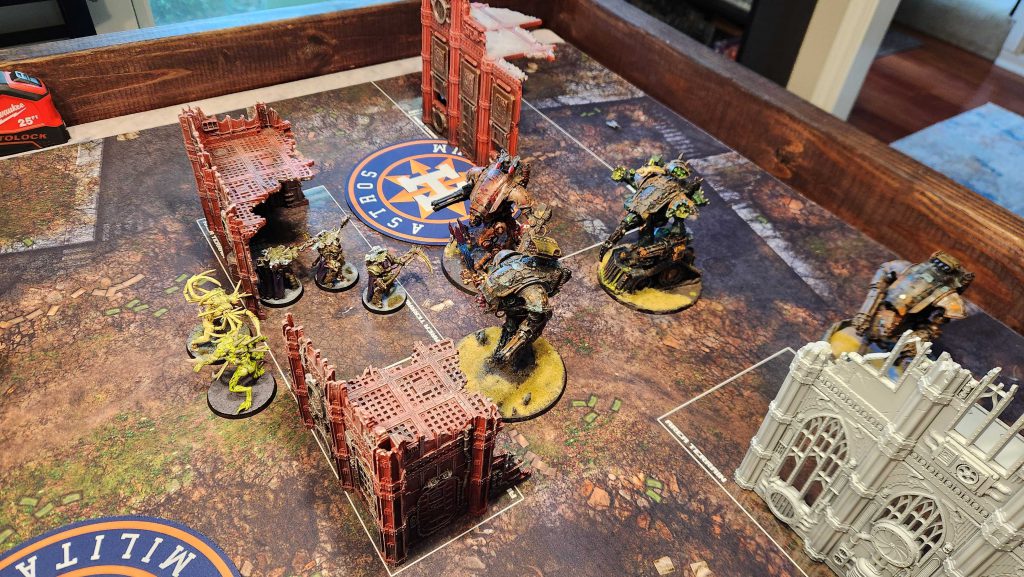 You may remember Luke from a few weeks ago, when I was testing my army against Codex: Chaos Knights. Well, Luke was back again this week, mostly because he had to drop something off at my house, and we played another game in the meantime. Luke has been testing new builds with Chaos Knights and this time around decided to test something with the War Dogs detachment and a heavier dose of Daemons, packing Bloodletters, Flesh Hounds, Nurglings, and Beasts of Nurgle. This is all a net negative against my list, as the mortars love killing Flesh Hounds, and I’ll gladly spend a turn or two picking up cheap scoring units to make the dogs worse.