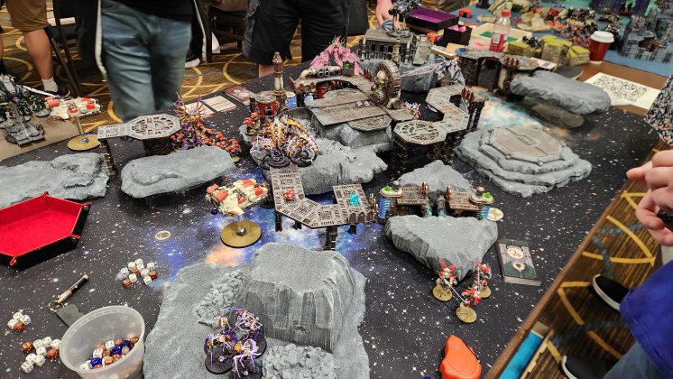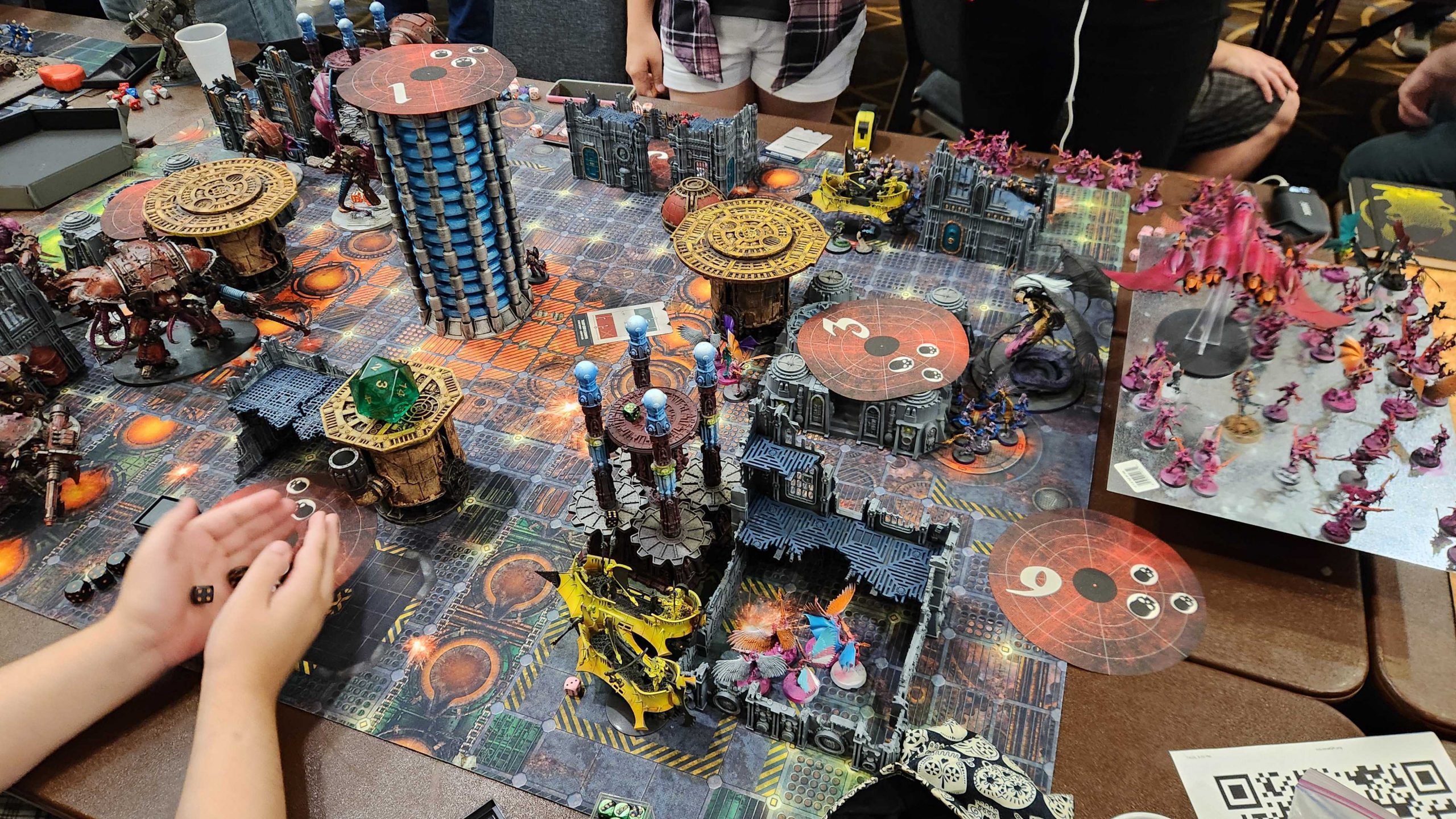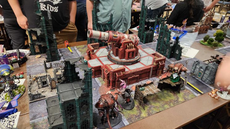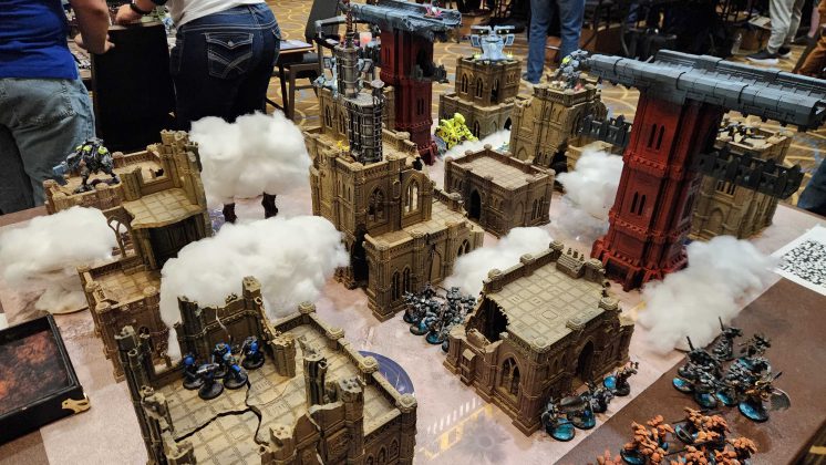 I’m really proud of the tables we set up for this one. The stand-outs were the spires – that vertical table with the clouds that represents fighting on the tops of buildings – the orbital platform table again, and the Harridan table, where players fought on the back of a massive flying Harridan. I was also a fan of the Spaceport, just because I thought it looked cool, and the sewers had their charms as well.