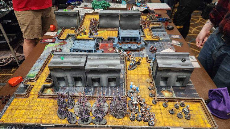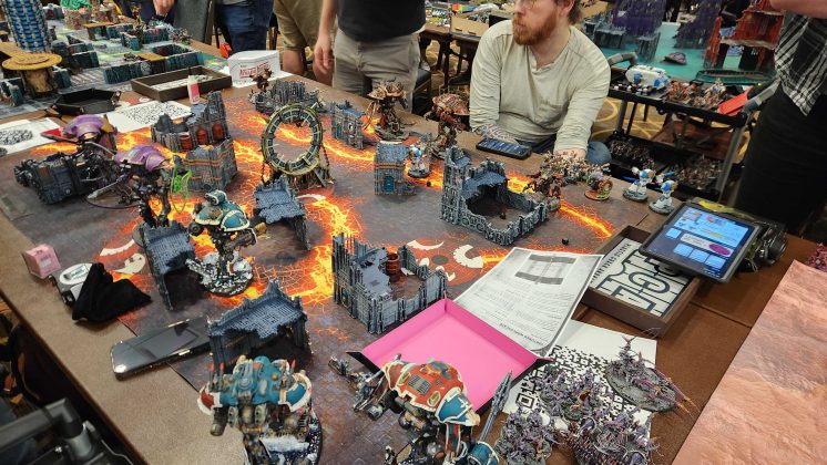 We ran a Teams event this year for the GHO narrative, splitting players into six teams of five players each, set on three alliances – Imperial, Chaos, and Xenos, roughly. Every round each team was sent to a different war zone, each with three tables. And on arrival, our players had to allocate their players to those tables, usually in a 2v2, 2v2, and 1v1 pattern. This freeform allocation let us go a little bit crazier this year with the tables, and we usually create tables that advantage different armies or require units like AIRCRAFT and Flyers.