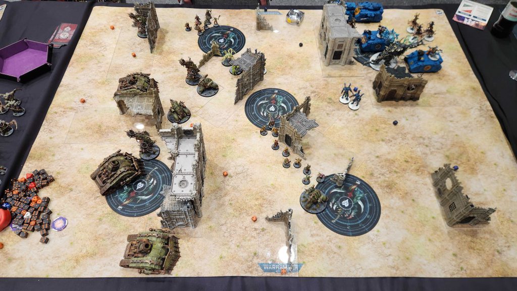 I tell Brandon going into round 2 that he’s not going to enjoy my shooting phase at all, and that ends up being the case as I watch the life slowly drain out of his eyes. My mortars were on fire this game, and when I killed the first doomsday ark with a bloat-drone it exploded and afflicted every unit nearby. Then on round 2 I started by dropping the strat on his home objective to battle-shock every nearby unit and Brandon failed all three of his tests that round, forcing him to move the other ark over to the objective to hold it.