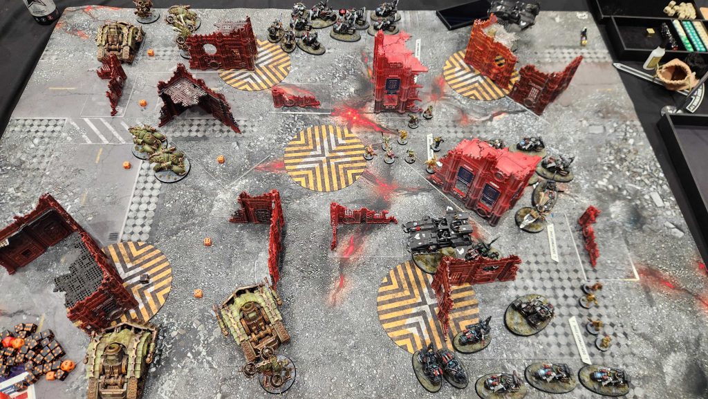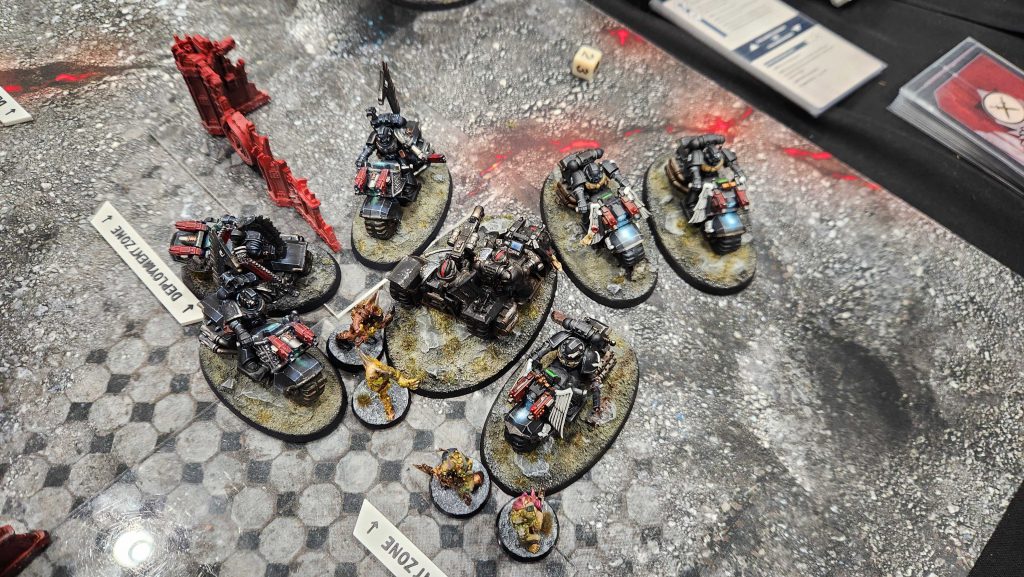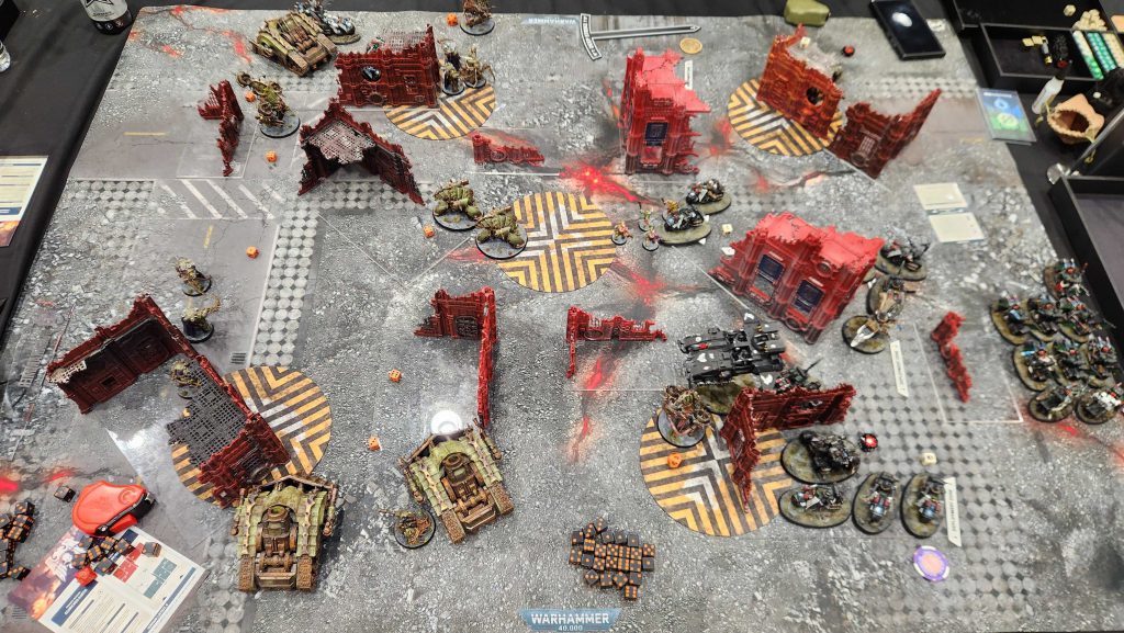 Welp, I should have known I’d have to play Knights again. This one’s Chaos Knights, and arguably worse for me – the Lords of Dread ability to sticky objectives with OC 5 is just a nightmare for me, and this game is either going to have me killing two Lancers early or losing.