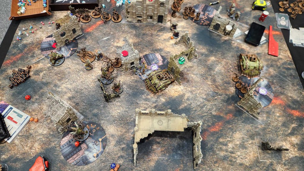 …and it doesn’t work. I knock it down to 3 wounds after charging with the Lord of Contagion but I can’t get it there. I lose the game 71 – 74 after giving up a whopping 9 VP to Challenger cards.