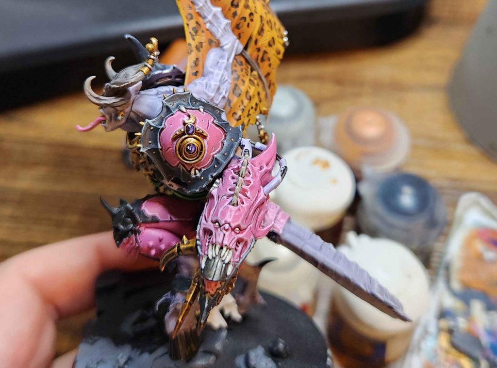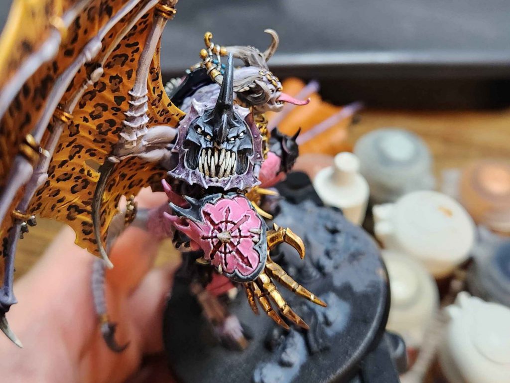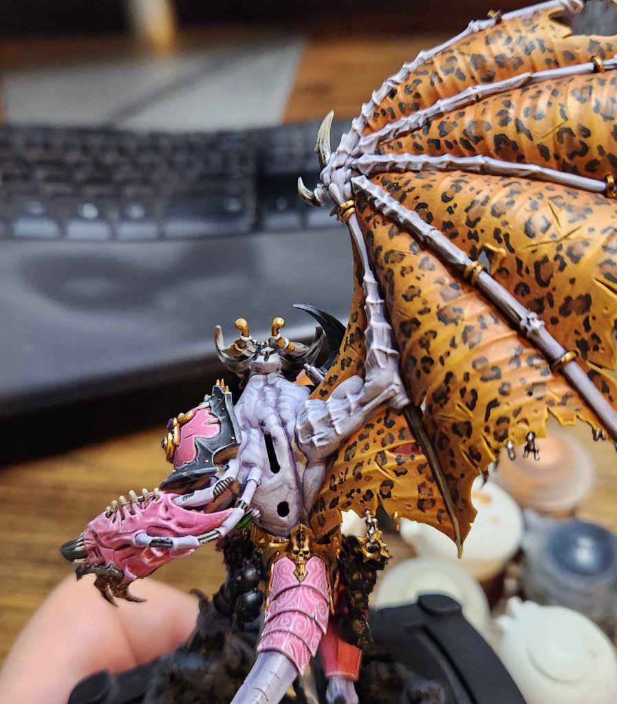 This week I’ve been working on my Daemon Prince. I showed my work in progress shots of him last week and since then I’ve been working on finishing him, but it’s taking a little longer than I’d like. I liked how the orange wings looked last time, but they were too plain – big, open spaces like that need detail or something to really make the model stand out, and so I decided to give him leopard spots. It looks great and tacky in the best way.