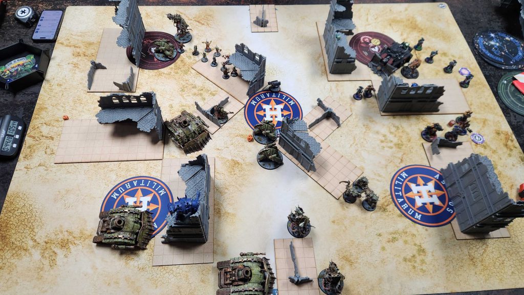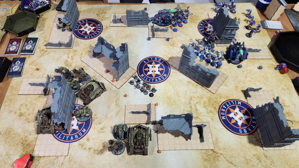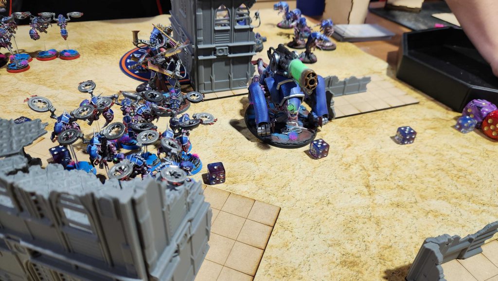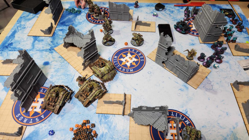 Eric’s got a lovely “mechanical Tyranids” list with lots of converted and 3d-printed models. It’s an interesting list and I know it can get up to some real shenanigans if I let it but I really just need to keep the Tyranids dropping in front of me and not behind, which mostly means screening for 9″. The big priorities here are killing the Biovore – dropping that with mortars is what I call a “twofer,” or one of those situations where you kill a key backfield unit and then opponents have to spend the rest of the game using another, more valuable unit to hold home, effectively “killing” that unit as well. It also gives me the indirect supremacy I need. After that I need to kill the Swarmlord and the Exocrines and once they’re dead the game is over.