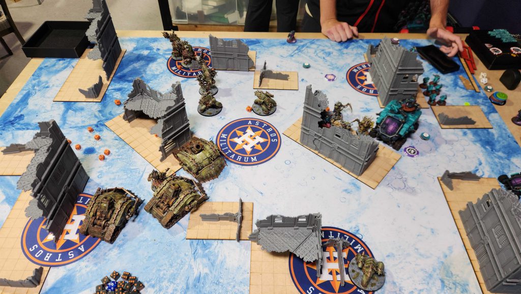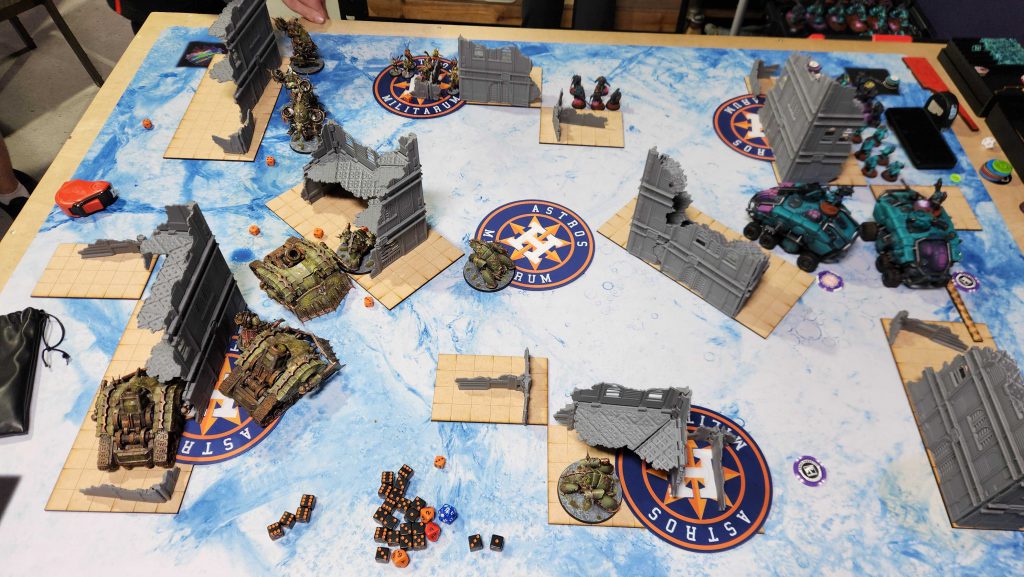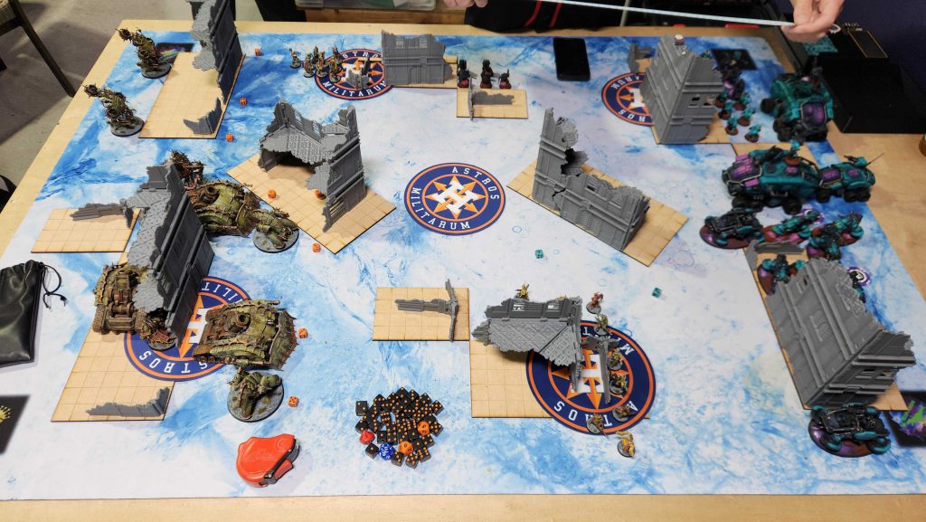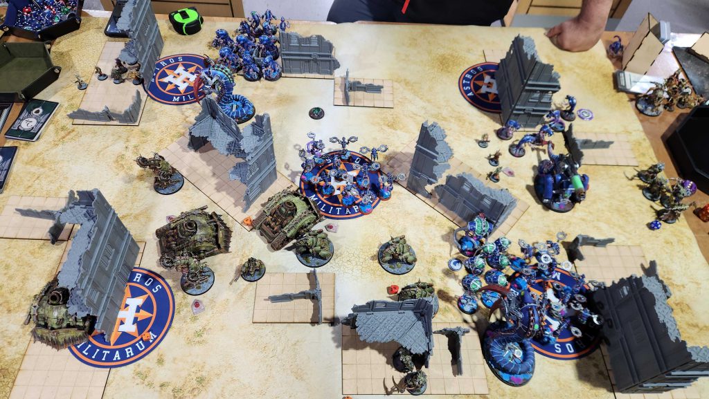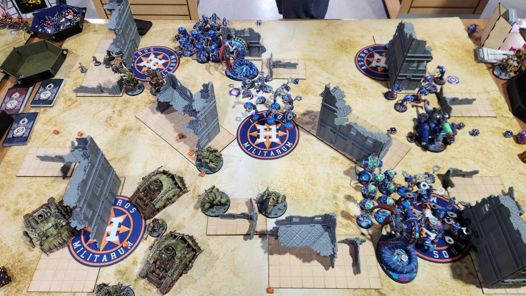 I’ve played against new Votann before, but only in testing against Shane’s Brandfast list. James is running Needgard, who have what looks like infinity YP by round 3. James is also running a very cool looking army of teal-and-purple Kyn, all painted well (though still a work in progress). James also had a cool theme going on – his army were 100% ironkyn, and he only used the little dome heads for his models. Very cool!