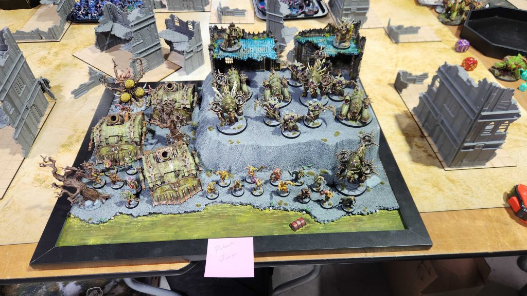 I’ve also mentioned before that the big downside to playing Death Guard is that it more or less stops me from getting Best Painted. At a smaller event like this, that’s not necessarily true, however, and I like my chances after looking at the competition. My Death Guard have some warts, sure – there’s a broken spike and horn here and there – and dark green and brown armies just tend to not draw the attention you want when it comes to judging. That said, my stuff is still pretty good on a technical level despite being among the older models in my play rotation. The other upside is that, this being a local event, I have a display board I can easily bring.