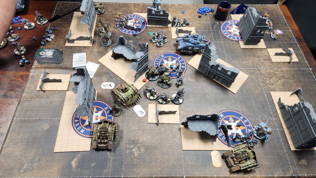 KC’s list can be a real nightmare – it scores well and can hit like a truck if you aren’t careful. It has a ton of CP to work with, and while it’s a bit slow, once it gets to you that can be goodnight. My big concerns here are the Vindicators, which will kill anything they see, and Calgar’s unit. I also need to kill the Scouts immediately with mortars – they’re the key to KC’s scoring. I’d like to also kill the Infiltrators, since home is worth quite a bit on this mission.