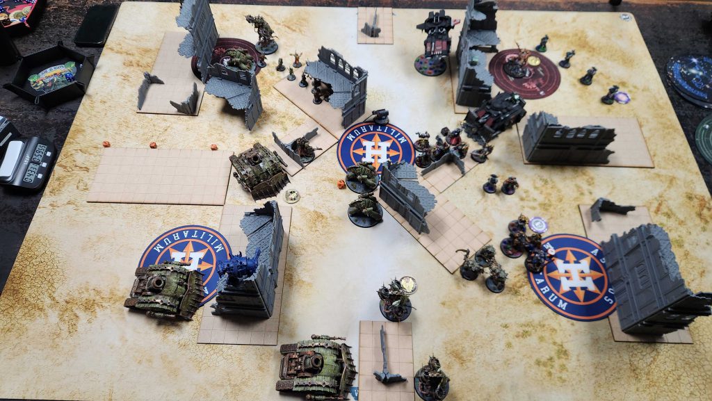 That’s fine by me, and I kill his Vindicator, then use the mortars to dump a bunch of shots into Calgar’s unit to soften them up. My goal here is to get as much done as I can early before those Centurion Devs show up and cause problems. The Deathshroud fight for the lower right objective, which goes… only OK. True to his army’s ability, KC is able to cause problems for me after this, and his other vindicator puts in work, partnering with his Storm Speeder to destroy a PBC while the Dev Cents and Calgar kill the Deathshroud and take out a couple of drones. The Judiciar and BGVs had a huge advance (6″) out to midfield, where they killed one of my Blight-Haulers and I failed all three saves with my Lord of Virulence to die there. That’s a big blow, and it makes this all closer than I’d like.