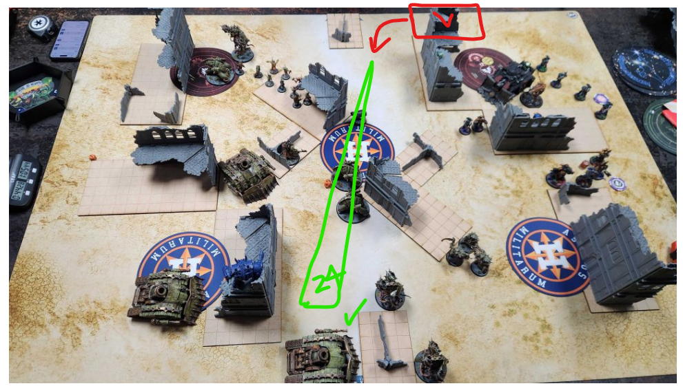 My big advantage here is that they only have 24″ range, and Kevin has to be conservative with them in deployment. This gives me a clear spot I can deploy out of the big L and still be out of range for his vindicators, even if they get a 6″ advance and use the stratagem or doctrine to advance and shoot: