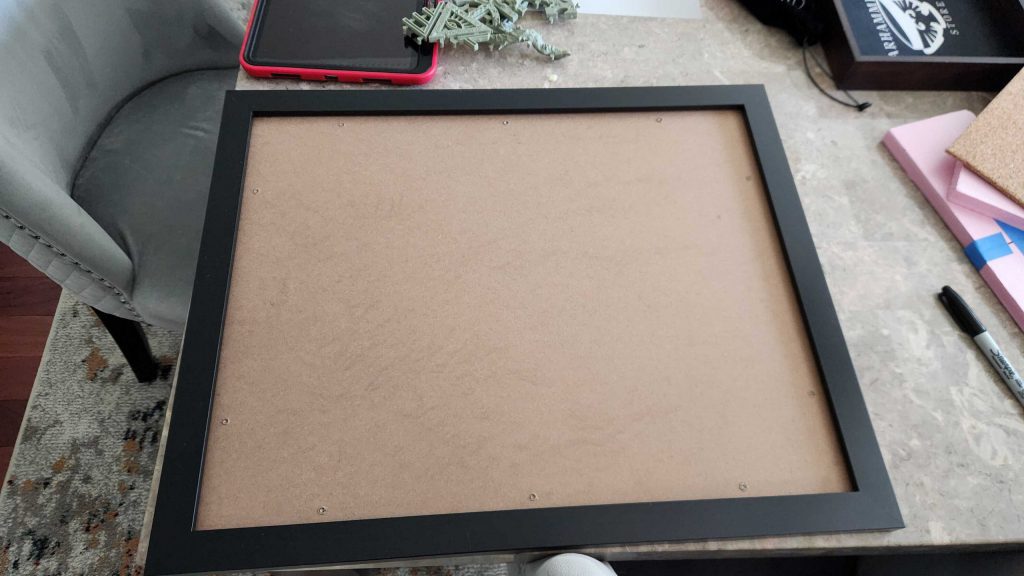 My big hobby project – other than actually painting the Emperor’s Children I own – is getting the new display board together. This typically starts with a picture frame. I order frames that are 16″x20″ as these generally hold an elite army well and fit into my suitcase for transit. The goal here is something that’s functional and pretty but also relatively flat and easy to travel with – big display boards are a pain in the ass and I’ve got to fly to Atlanta, so the primary goal here is something I can put removable pieces on.