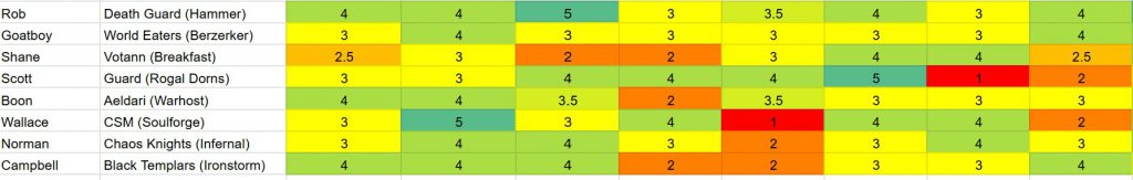 When I built the matrix, I started by having the team fill it in, but I also looked at their most recent tournament games – many of them went to NOVA – and used those scores to fill in scores as well. This gave me a pretty good matrix, but also one that feels wildly optimistic – but this is a problem which i think a lot of player matrices will have. When you build a team of people who win 60-80% of their games, it’s not out of the question for them to score all their games as 12+ wins, regardless of whether that’s realistic. When I do pairings, I’ll be looking for the 3s and 4s and trying to identify where someone has played a matchup before – having faced an army is ultimately the biggest factor in being able to beat them and play well in that matchup.