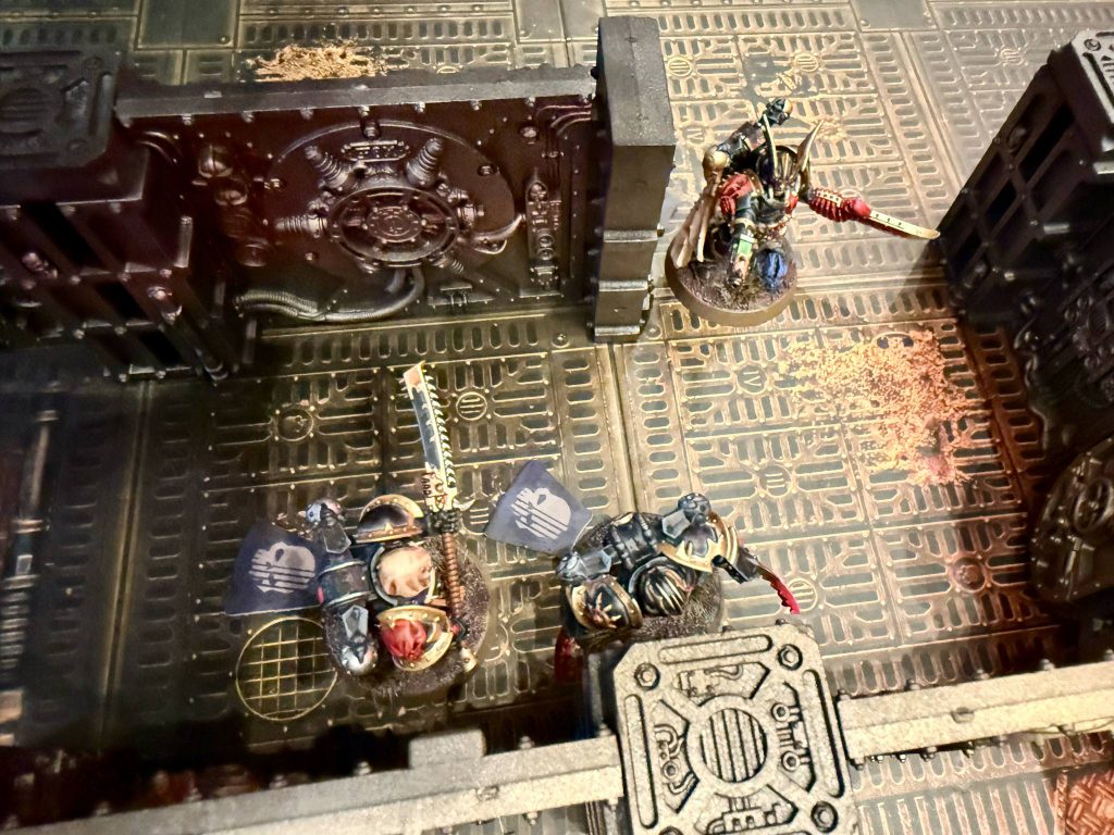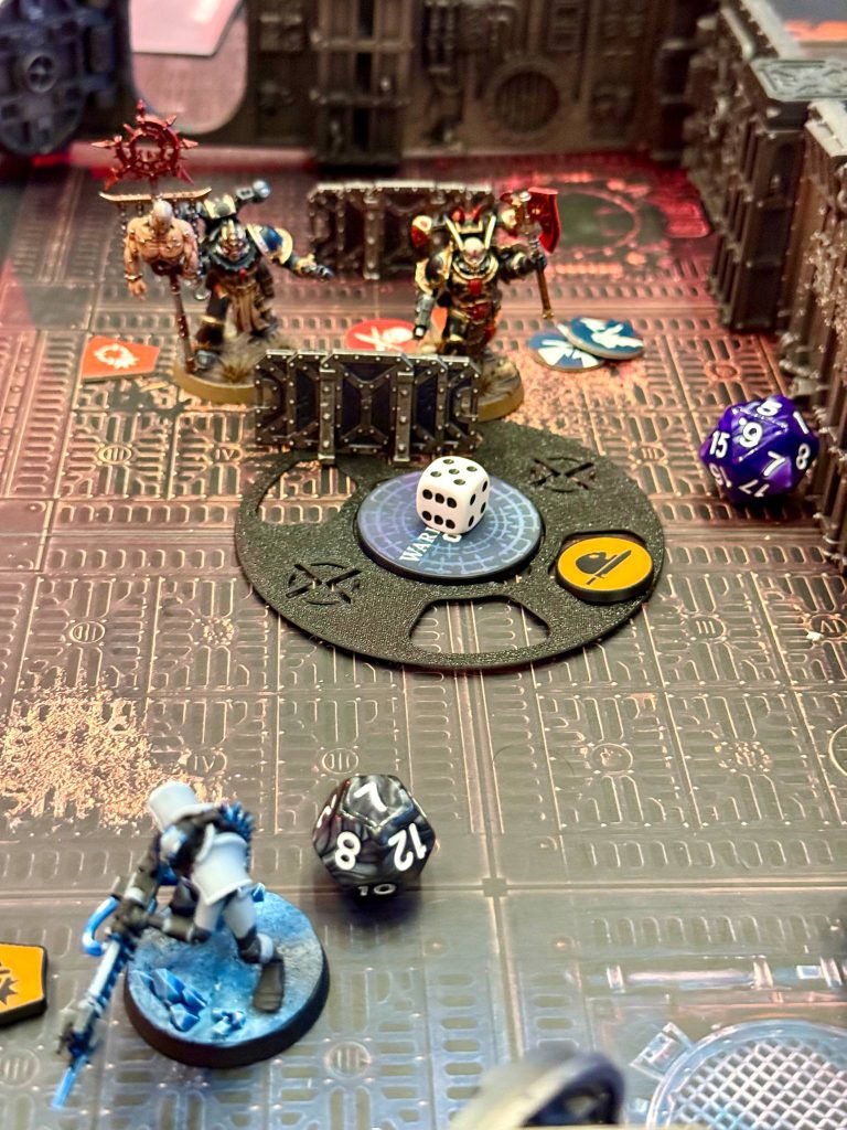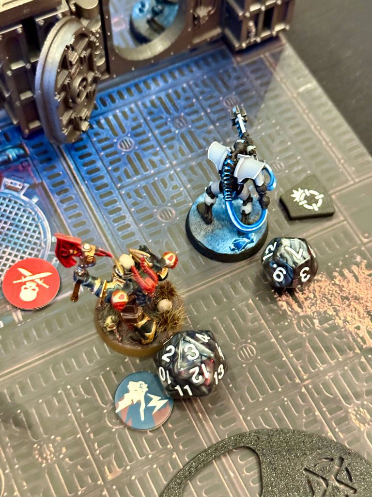 From here, my groove is in shambles. I tap the point with my Ventrilokar, instead of playing safe and tossing a smoke, which means I eat another missile to the face and lose the operative. I kill his Anointed with my Screecher, which is good, but he reduces my APL with the Slaanesh ploy and walks his Chosen into engagement. I try to kill the Chosen with the Skinthief, and then get owned instead. The Screecher tries to finish the job, but gets picked up instead. The Visionary finally ends the Chosen’s reign of terror with a plasma pistol shot, but not before I eat four damage from a bad hot roll. Turning point four, I’m down to two operatives, both injured and scared shitless.