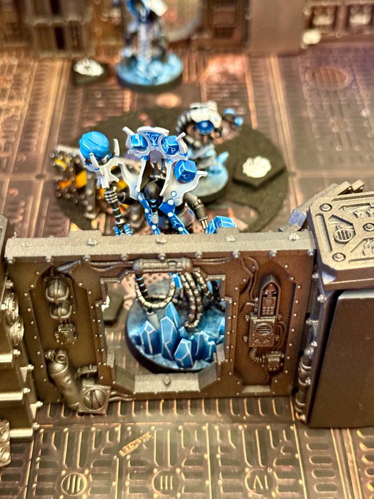 Meanwhile, in the central room, things are actually going worse. We both set up meltaguns on guard to try and punish the first person to walk into the objective, and I toss a smoke grenade into the room with my Visionary so my Screecher can dart in and perform a safe secure. Importantly, I’ve also skipped an activation with my Visionary to give me an activation advantage against Charles. As it turns out, this literally blows up in my face when Charles realizes I’ve given him an extraordinarily tasty counteract shot with his fireball on three targets. While my Screecher is fine, I still cannot roll saves and my gunner is brought down to four wounds left and my Visionary down to six. This is a disaster.