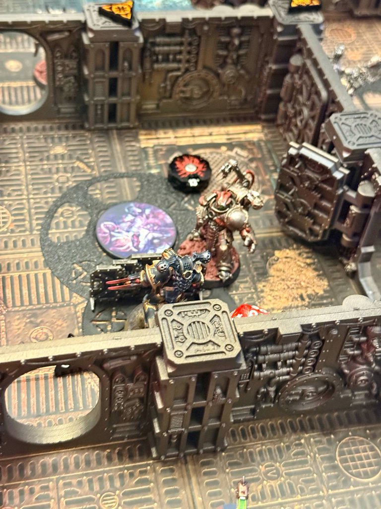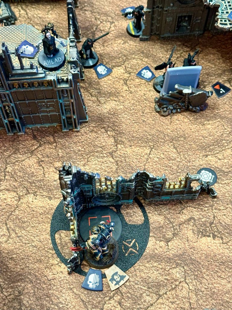 Then Aiden sends some dorks with flamers to deal chip damage to my Visionary, and even with smoke I roll so badly on my saves that I’m forced to use my foreboding ability to negate a normal flamer to even remotely think about surviving a meltagun shot. Which, of course, I don’t, and the Missionary scores Aiden Storm Objectives for his trouble.