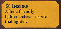 Borgit, like Zondara, brings another generic delve synergy. Your fighters inspire when they delve, and it doesn’t matter whether they’re delving a treasure, cover, or AG token. There’s some potential here in running one of the weaker goblins in the back field of your opponent’s territory to camp on their AG token for scoring purposes, but you can also get a “free” inspire out of it.