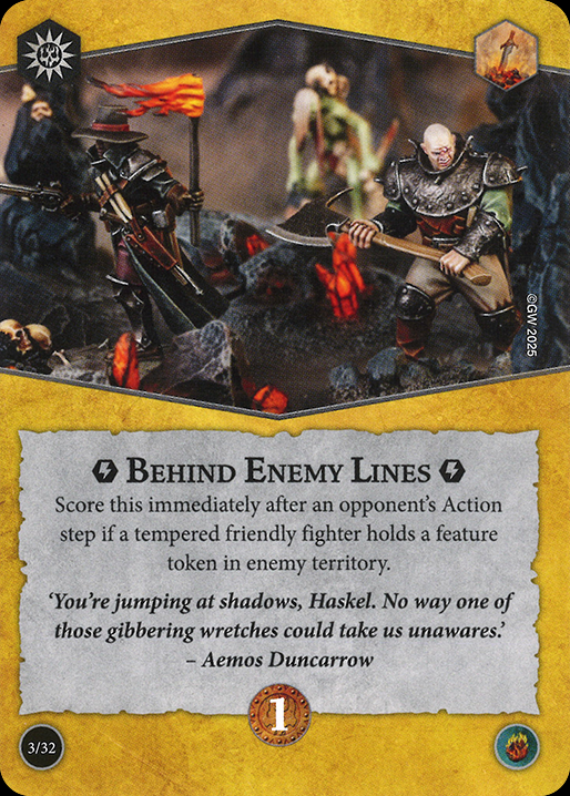 This deck brings Behind Enemy Lines, another objective that gets easier to score with the introduction of AG tokens. The very nature of this objective requires you to invade the enemy territory anyway, so using an AG token to score it is even more tempting – gain one glory now, then potentially one more at the end of the round if your opponent can’t stop you.