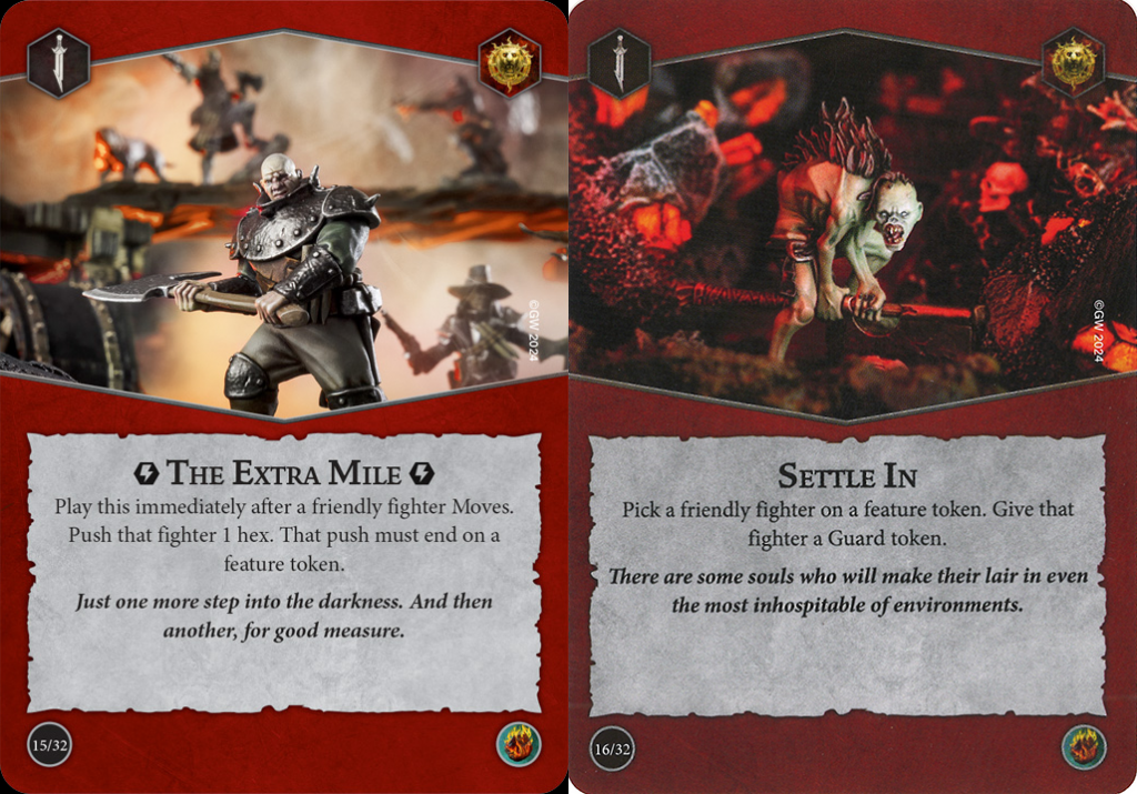 More commonly seen in decks is Settle In. When your scoring is gated behind staying in one spot, being able to pick up a guard token that prevents drive back and makes that fighter a little more durable goes a long way. This will typically be used to ensure scoring something like Supremacy or Iron Grasp (worth three and two glory, respectively) but if those have already been scored by the time you draw Settle In, it can also be used to snag yourself a glory and a heal off of an AG token.
