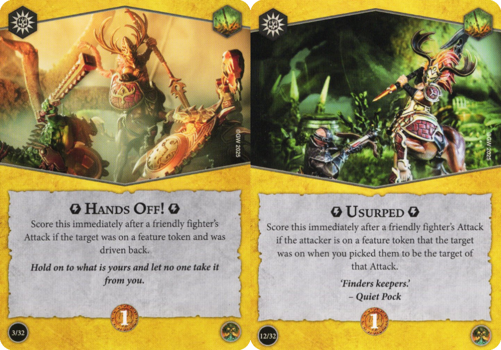 Hands Off! is convenient because you’re typically going to want to drive your opponent off of feature tokens if they’re trying to stand on them anyway. For some warbands and game plans, they’re going to naturally want to do this. Against an aggressive opponent who doesn’t care about feature tokens, the introduction of AG tokens gives them a reason to want to. Otherwise, you’re limited to working pretty hard to drive enemies back onto a token just so you can drive them off again.