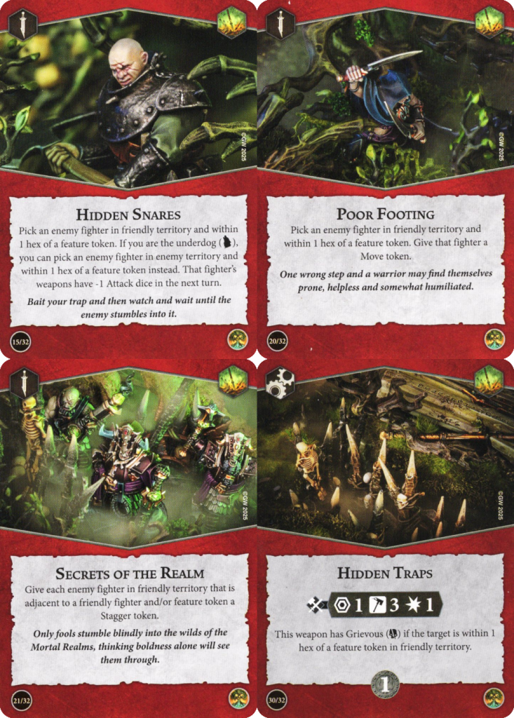 The deck also has three ploys and one upgrade that care about enemy fighters being adjacent to feature tokens in your territory – Hidden Snares, Poor Footing, Secrets of the Realm and Hidden Traps can have a surprisingly large amount of reach if you assume there are three to four feature tokens on your side of the board. Each feature token creates a little seven-hex bubble and that results in far fewer safe places for your opponent than it seems at first.