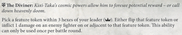 Kixi-Taka already has a very strong ability in The Diviner. Being able to inflict a damage without any dice rolls or caring if the enemy is vulnerable is quite threatening and it can be used up to three times in a single game. As I mentioned up in the Hunting Grounds discussion, each feature token creates a little seven-hex bubble of danger when Kixi-Taka is on the board. Adding AG tokens to the mix – your own and your opponent’s – creates even more hazardous areas for your opponent to try and navigate around.